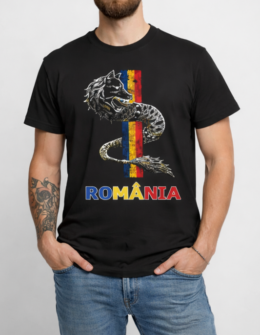 Tricou România cu Lup Dacic – Tricou Unisex 100% Bumbac, Print DTF Premium